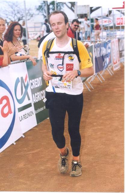Arrivés au ravitaillement du Colorado, on sent quand même l’écurie. Je remets mon tee-shirt de la course obligatoire pour franchir la ligne d’arrivée et chacun se lance à son rythme dans ce qui sera la dernière descente. Là non plus pas de répit, pas de descente tranquille et bucolique sur un sentier doux. Non, c’est une bonne grosse descente merdique avec plein de cailloux avec l’arrivée qu’on voit de haut mais qui n’arrive jamais. Pensant être assez près de l’arrivée, j’arrive à la hauteur d’une gentille spectatrice qui m’annonce le temps de parcours qu’il me reste : environ 30 mns. Complètement à bout moralement, je lui gueule qu’elle doit exagérer (c’est souvent le cas des spectateurs sur ces courses qui donnent des indications fausses). Malgré ma réaction vive elle essaie de me réconforter en me disant que c’est un sentier typique. Alors là non, ça m’étonnerait que beaucoup de Réunionnais marchent sur ce sentier merdique tout près d’une ville. Typique pour les touristes oui. Je m’en veux encore d’avoir été aussi méchant avec elle, d’autant qu’elle avait raison sur le temps de parcours. Il a encore fallu batailler au moins 20 mns en plus, mauvais pour le moral, en se faisant dépasser par plein de Réunionnais dans leur élément, et avec une tendinite vraiment douloureuse. Enfin, j’atteins la route qui marque la fin de la descente et l’arrivée toute proche (j’entends le speaker). Là histoire d’en finir au plus vite, je pars en sprint et arrive complètement à bloc au point que j’ai du mal à respirer sur la ligne d’arrivée et que j’inquiète les bénévoles. Pas de soucis, le bonheur d’avoir bouclé cette course en 34h50 m’envahit tout simplement. Je mettrai quelques jours à récupérer sous le soleil Mauricien mais je sais maintenant que je peux finir ce genre de course. Le bonheur et le soulagement … | |