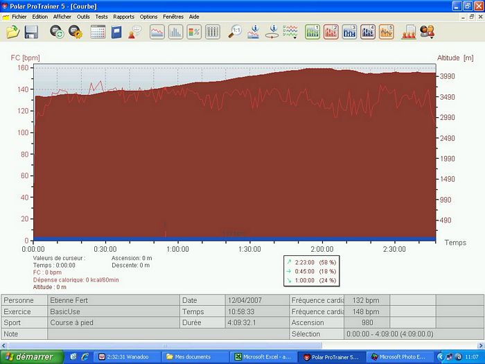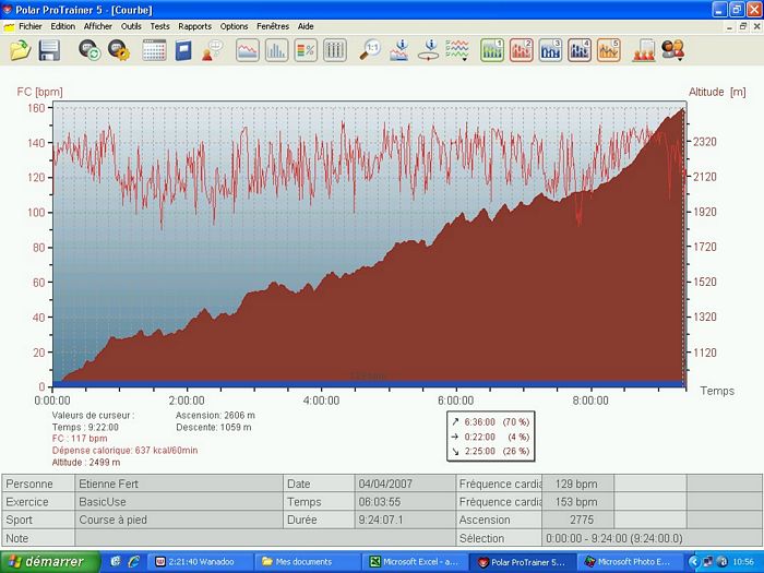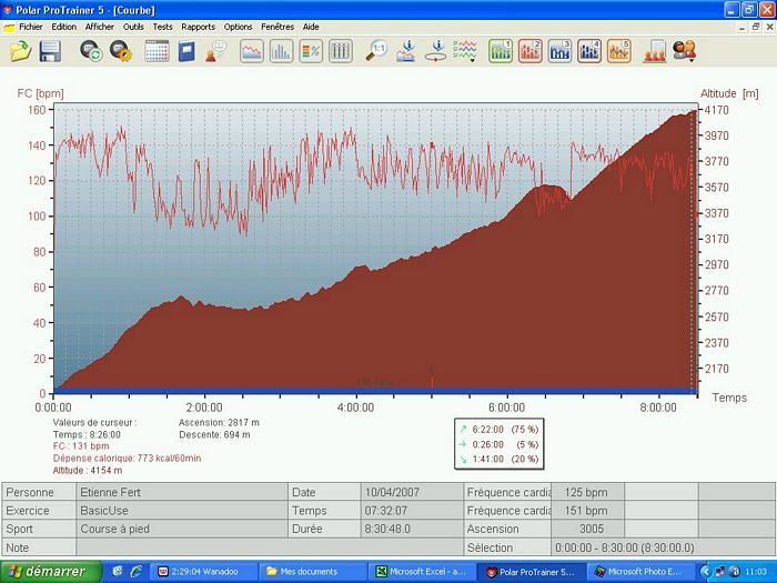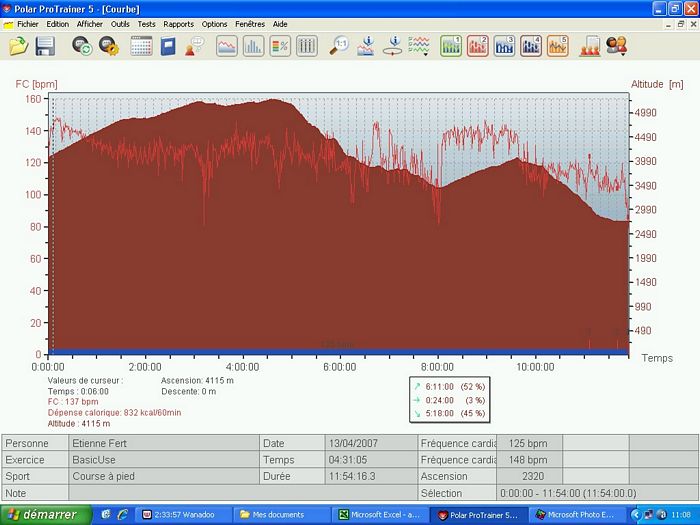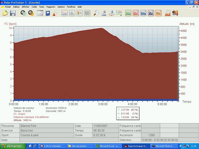 Deux départs sont prévus pour cette étape. Les marcheurs et les coureurs les moins rapides partent à 3h et les autres devraient partir à 4h. Avec les retards classiques sur ces départs très matinaux, nous décollons à 4h30. Le rythme est très rapide. C’est le dernier jour, chacun jette ses dernières forces dans la bataille et souhaite finir en bouquet final pour le dernier passage à plus de 5000m. Au bout de 15 minutes de ce rythme infernal (600m/h à 4000m …), je décide de ralentir pour me ménager tout en gérant le petit écart qui se creuse avec mes concurrents directs. A ce moment, je repense au tour de France que je regardais dans ma jeunesse et à la gestion de Bernard Hinault. Il était souvent distancé dans les premiers kilomètres des cols mais revenait tranquillement à son rythme. J’espère pouvoir l’imiter à mon modeste niveau. Au lac Tilicho, le jour s’est maintenant levé et le panorama sur le lac est grandiose même si il est en grande partie gelé. Gelés, nous le sommes aussi et la température glaciale a fait geler l’eau dans le tuyau de mon réservoir d’eau. Heureusement, j’arrive tout de même à extraire un peu d’eau de mon bidon. Sur le replat à côté du lac, je poursuis mon effort et petit à petit, je rattrape les coureurs qui m’avaient distancé. Au check point du col intermédiaire, je suis revenu dans les dix premiers et je me sens en pleine forme. Je continue sur ce rythme et je dépasse Jaganath qui était ce matin à dix minutes devant moi au général. Au lieu d’emprunter le passage classique du Mesokantu La qui est réputé assez raide, nous allons vers un autre col plus haut mais plus facile à descendre surtout compte tenu de la neige dans laquelle nous marchons depuis le lac. Après une longue traversée, j’arrive au col avec Bruno, en 5eme position. Et c’est aussi ma place virtuelle au classement général à ce moment. Si je garde l’écart sur Jaganath et si je reste avec Jean-Marc qui arrive bientôt au col, je finirai à une place absolument inespérée. Après une pause de quelques minutes pour apprécier le panorama inoubliable, je pars dans la descente qui est délicate sur le début dans la neige. Jomsom, qu’on aperçois au loin dans la vallée, semble bien loin. Je fais la descente avec un petit groupe qui prend un rythme raisonnable. Et soudain, ça s’emballe, Nigma et Lhakpa accélèrent sérieusement. Je me demande bien pourquoi elles ont soudain passé la vitesse supérieure. Je me retourne, je vois Magali et tout s’explique. La concurrence pour le classement général féminin. Tout le monde à emboîté le pas mais le cheminement n’est pas facile. Nous sommes passés par un col peu emprunté et il n’y a pas de chemin tracé. Il faut plus ou moins naviguer à vue en fonction du briefing d’hier et de la carte. Et justement, nous arrivons à un point crucial. C’est le petit replat à côté d’une crête. Nous avions l’instruction précise de ne pas prendre le chemin vers cette crête et nous ne suivons pas les coureurs népalais qui s’y sont engagés. En revanche, le chemin que nous devrions prendre à droite est loin d’être clair. Alors nous prenons le chemin qui s’engage dans le petit vallon. Au début, ça se présente bien mais nous arrivons dans une pente raide qui mène à un torrent qui descend doucement. Ca ne sent pas très bon et on a clairement quitté le chemin normal mais il nous semble qu’il sera possible de retrouver le chemin en suivant le ruisseau. Plus tard, nous retrouvons les népalais qui ont empruntés la crête et sont finalement descendus dans le vallon. Nous formons un groupe de 7 coureurs. En remontant sur les hauteurs, nous avons réussi à retrouver un semblant de chemin. Malheureusement, c’est un leurre. En continuant la descente, nous aboutissons sur un cul de sac. Seul Bruno, devant, parviens à passer au prix d’une chute assez dangereuse. C’est un plan galère. Alors, je décide de repartir seul sur la crête pour retrouver le chemin que nous voyons en face. Solution sure mais longue … très longue. Une heure de montée pour retrouver ce foutu chemin. Je suis revenu sur les rails mais l’erreur d’aiguillage m’a coûté un temps énorme. J’ai probablement perdu quelques places dans cette galère. Le moral est à zéro, je gamberge et je ne suis guère motivé pour aller vite dans cette descente. Pour ne rien arranger, je suis au bord de la fringale et il y a un énorme vent de face. Ras le bol ! J’arrive à Jomsom complètement épuisé après presque 12 heures de course. J’ai à peu près perdu 2 heures dans cette affaire et je pointe maintenant à la neuvième place au général. Dommage, mais je parviens tout de même à garder ma bonne humeur pour prendre une bière avec mes collègues. J’aurais en fait dû rester avec le petit groupe au moment où je suis remonté seul. Ils ont finalement réussi à trouver un bon passage pour retrouver le chemin et sont arrivés une heure avant moi. Relevé Polar | ||