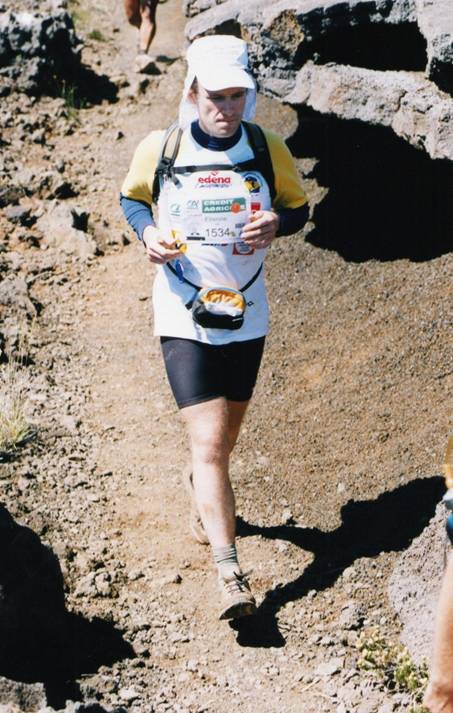 Un peu atteint, j’arrive au ravito de Foc-Foc et me dirige tout de suite chez les médecins pour demander un comprimé de Malox pour soigner cette acidité. Je mange aussi un peu de pain et rapidement l’acidité disparaît. Pour la tendinite, pas de possibilité de se soigner. La prise d’anti-inflamatoire donnés par les médecins entraîne automatiquement une mise hors course. C’est vrai que c’est un peu dangereux de masquer ce genre de douleur avec des complications potentielles. De toute façon, je ne gère pas trop mal et maintenant que le sentier est relativement plat, la douleur se fait discrète. En tout cas, c’est maintenant le moral regonflé à bloc que je repars vers la route du Volcan. Spectacle grandiose de ces paysages lunaires et des passages sur la crête qui offrent des panoramas vertigineux. On oublie tout pour se laisser aller au bonheur de la simple balade. Je cours bien et j’avale tranquillement la montée vers le point culminant de la course, l’oratoire Sainte Thérèse. Le début de la descente après l’oratoire : | |